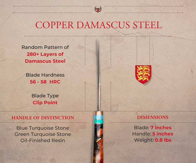 Each knife handle is a work of art, hand-carved from Ram Horn, Camel Bone, Turquoise Stone, Rosewood, walnut wood and more premium materials, ensuring a secure grip with a distinctive look that sets it apart. Designed for long hours of comfortable handling in the wild.