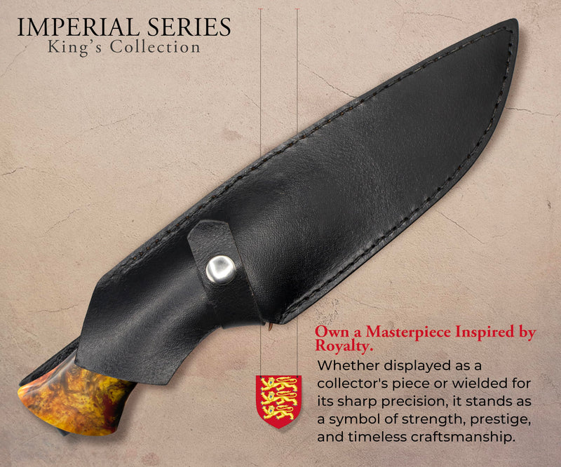 Your knife comes with a beautifully handcrafted leather sheath featuring a secure snap-lock and belt loop for convenient and safe carry during hunting, camping, or everyday outdoor tasks.
